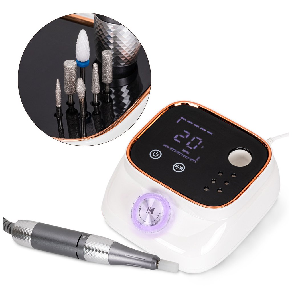 Profesionální bruskana nehty s velkým a čitelným LCD displejem spojuje funkčnost a eleganci. Nabízí otáčky až 45 000 RPM, dotykové ovládání a podsvícené diamantové kolečko pro plynulou regulaci i pauzu na zvoleném výkonu.
