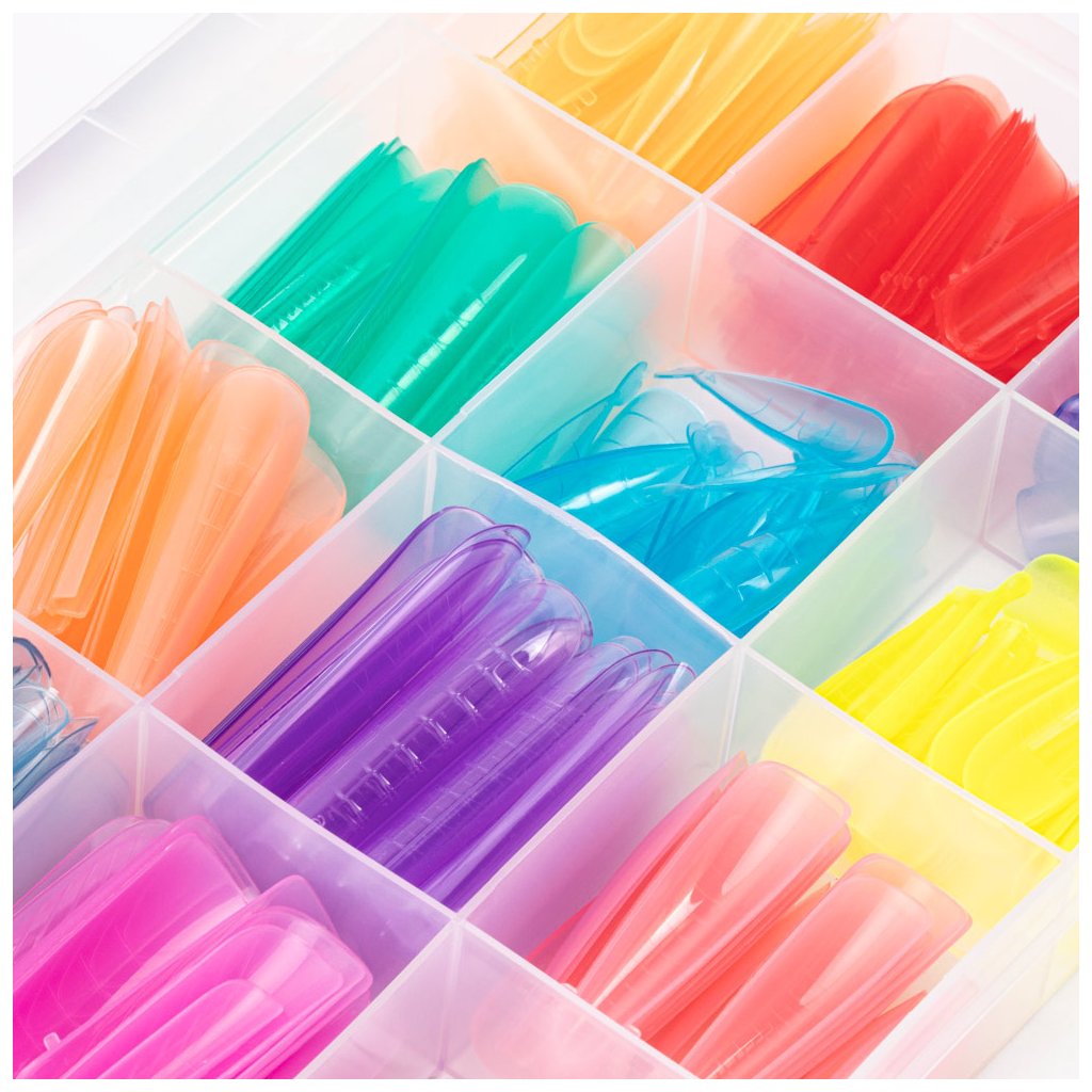Duální formy na nehty s měrkou – 288 ks v 12 tvarech. Flexibilní, opakovaně použitelné a ideální pro modeláž gelem i akrygelem.