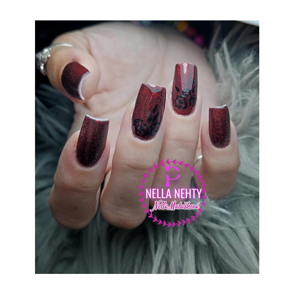 Intenzivně tmavě červený glitter gel lak s temným červeným základem a sytými malými červenými třpytkami. Perfektní volba pro slavnostní i výrazné nehty.