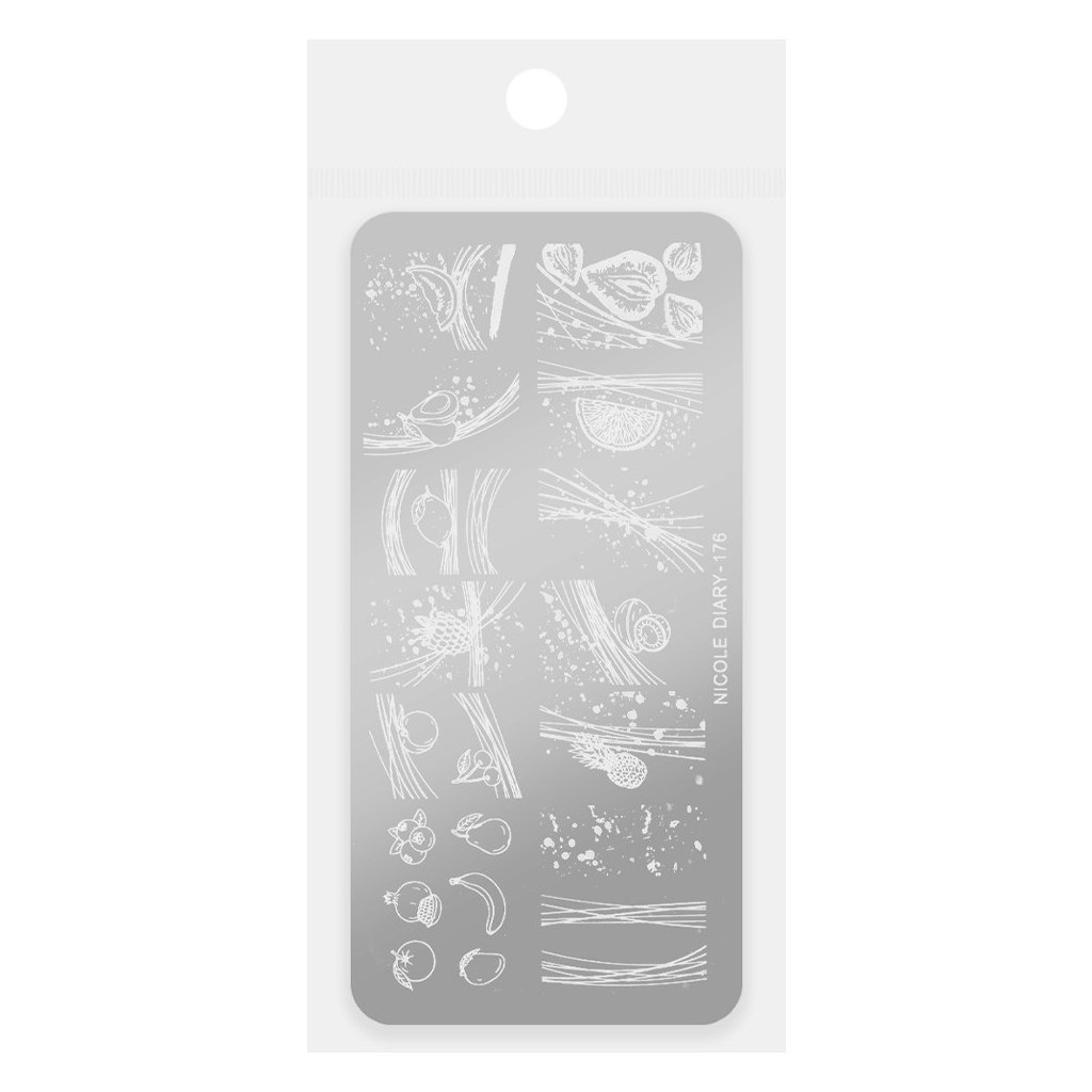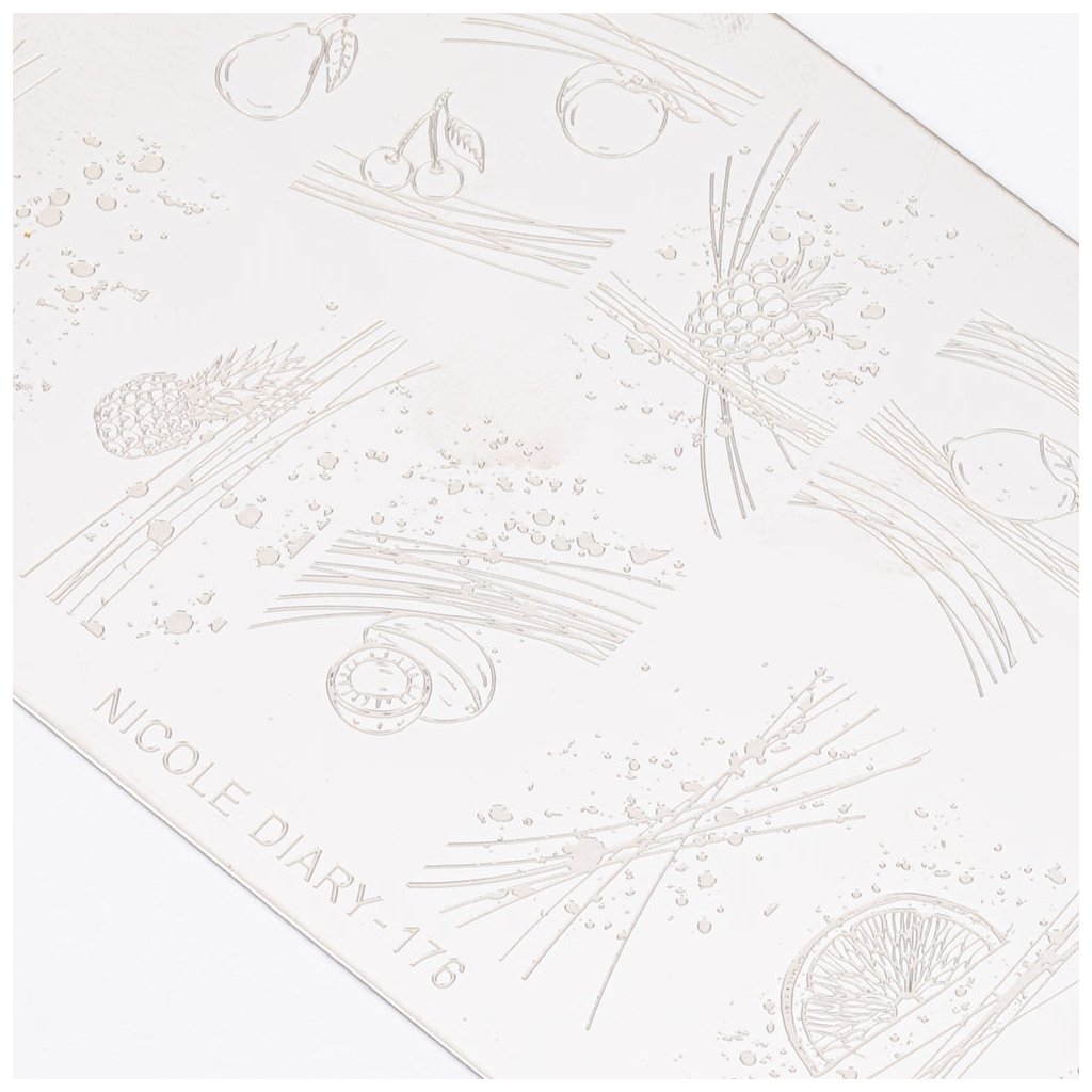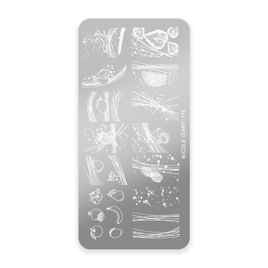 Osvěžte svůj nail art šťavnatými motivy! Destička Nicole Diary č. 176 je ideální pro letní a ovocný design. Obsahuje detailní vzory jahod, kiwi, třešní, ananasu a citrusů s efektem cákanců a šťávy. Vytvořte si realistické, gurmánské nehty během sekund.