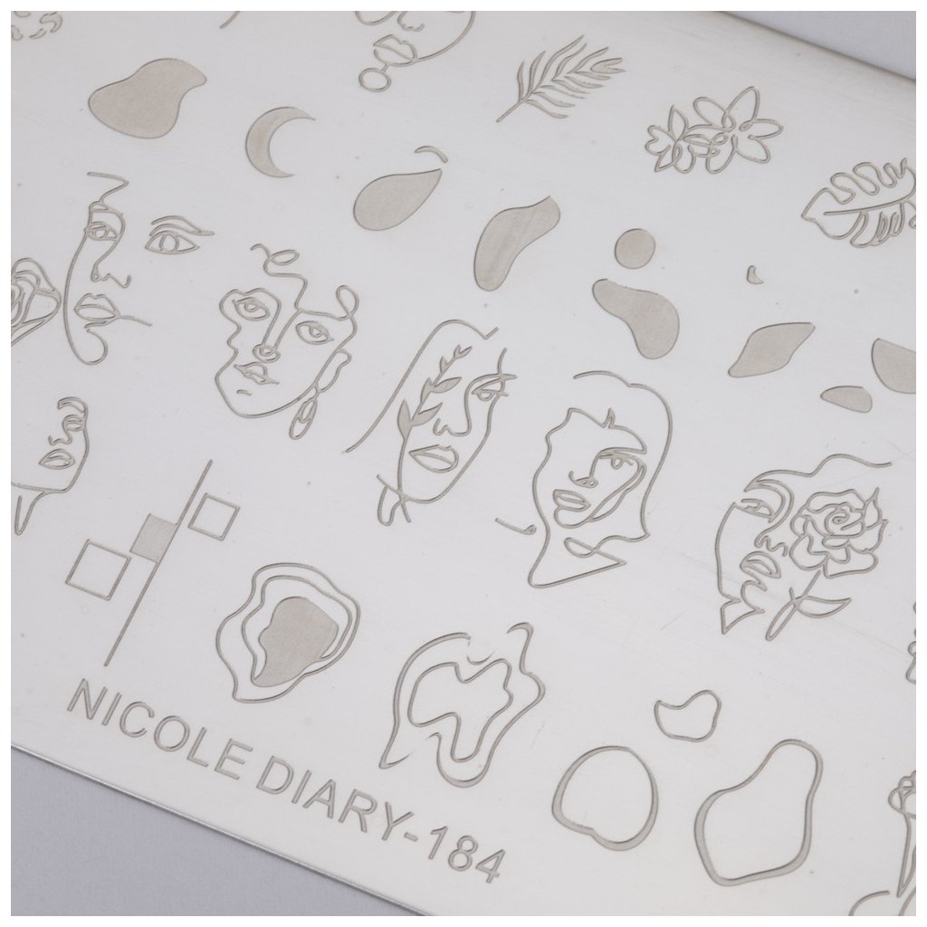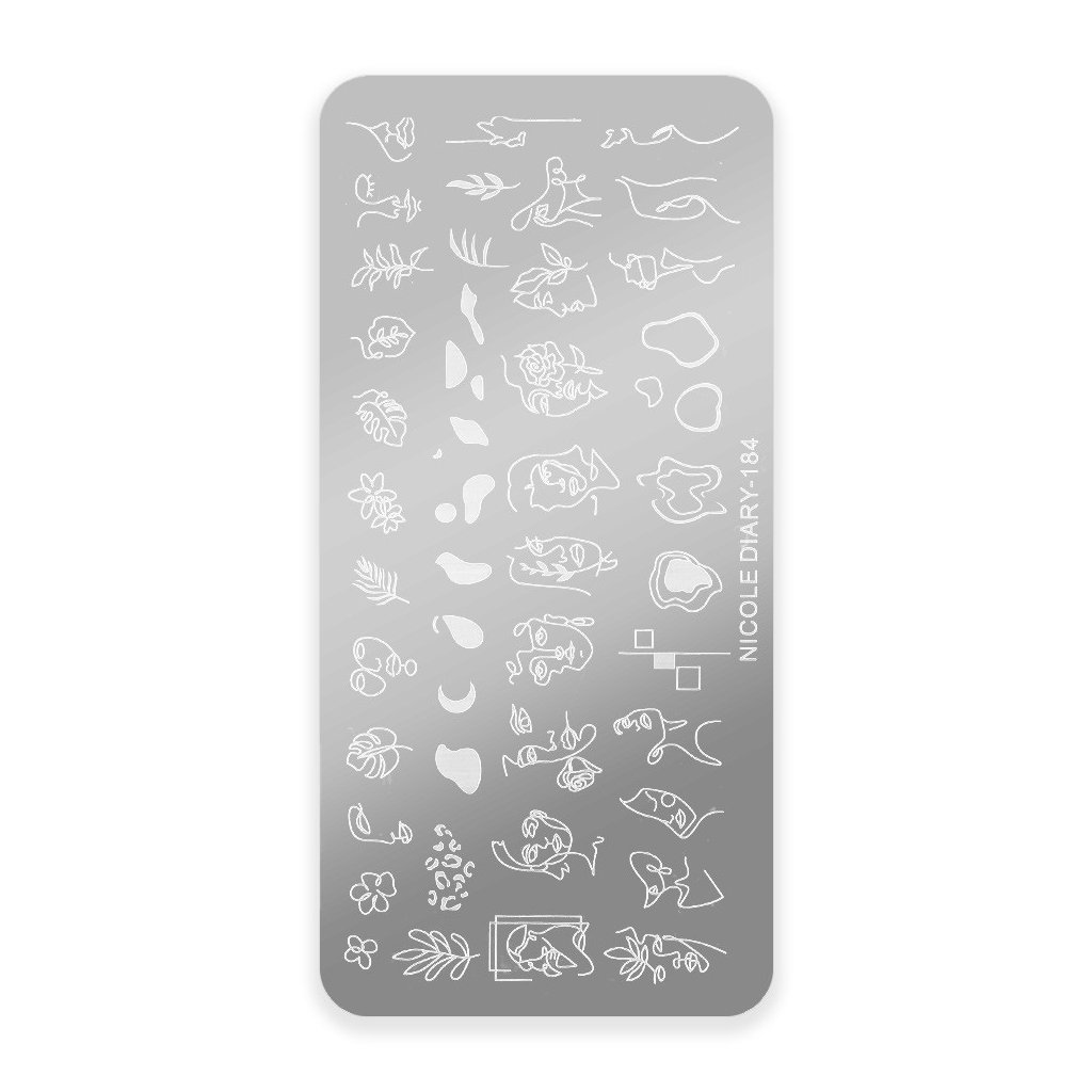 Přeneste na nehty ten nejžhavější umělecký trend! Destička Nicole Diary č. 184 kombinuje minimalistický One Line Art (tváře, postavy) s organickými motivy listů, květin a trendy leopardího vzoru.
