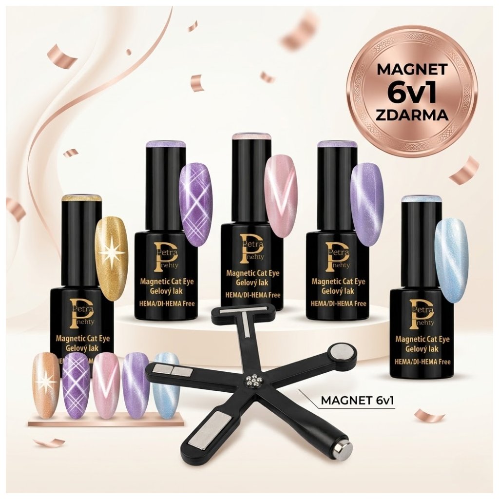 - 5x Magnetic Cat Eye gel lak: Výběr těch nejžádanějších odstínů (od levandulové až po ledově modrou), které mají perfektní krytí a hluboký odlesk.