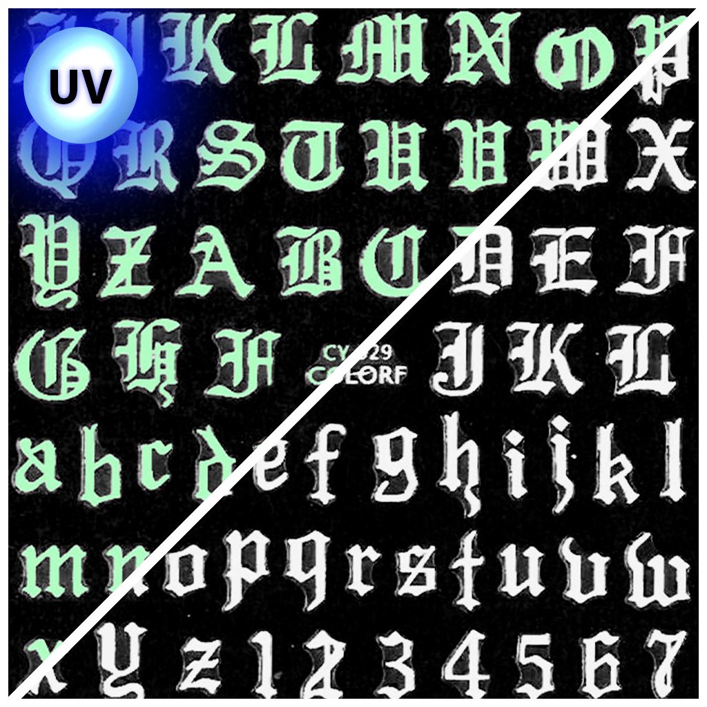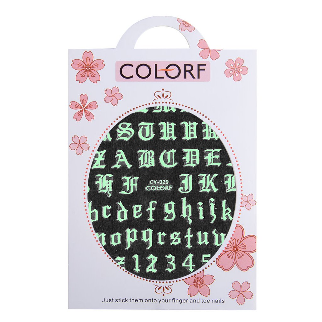 Chceš nehty jako z jiné galaxie? Samolepicí nálepky COLORF CY-029 jsou přesně pro tebe. Obsahují motivy Gotické abecedy a čísla – a navíc krásně svítí ve tmě i pod UV světlem.