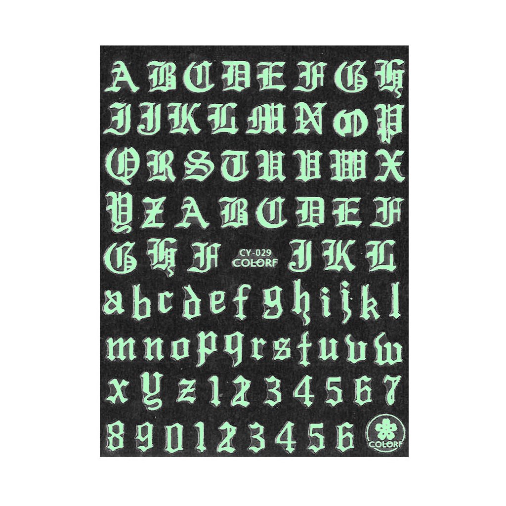 Samolepka na nehty svítící ve tmě - Gotická abeceda a čísla 029