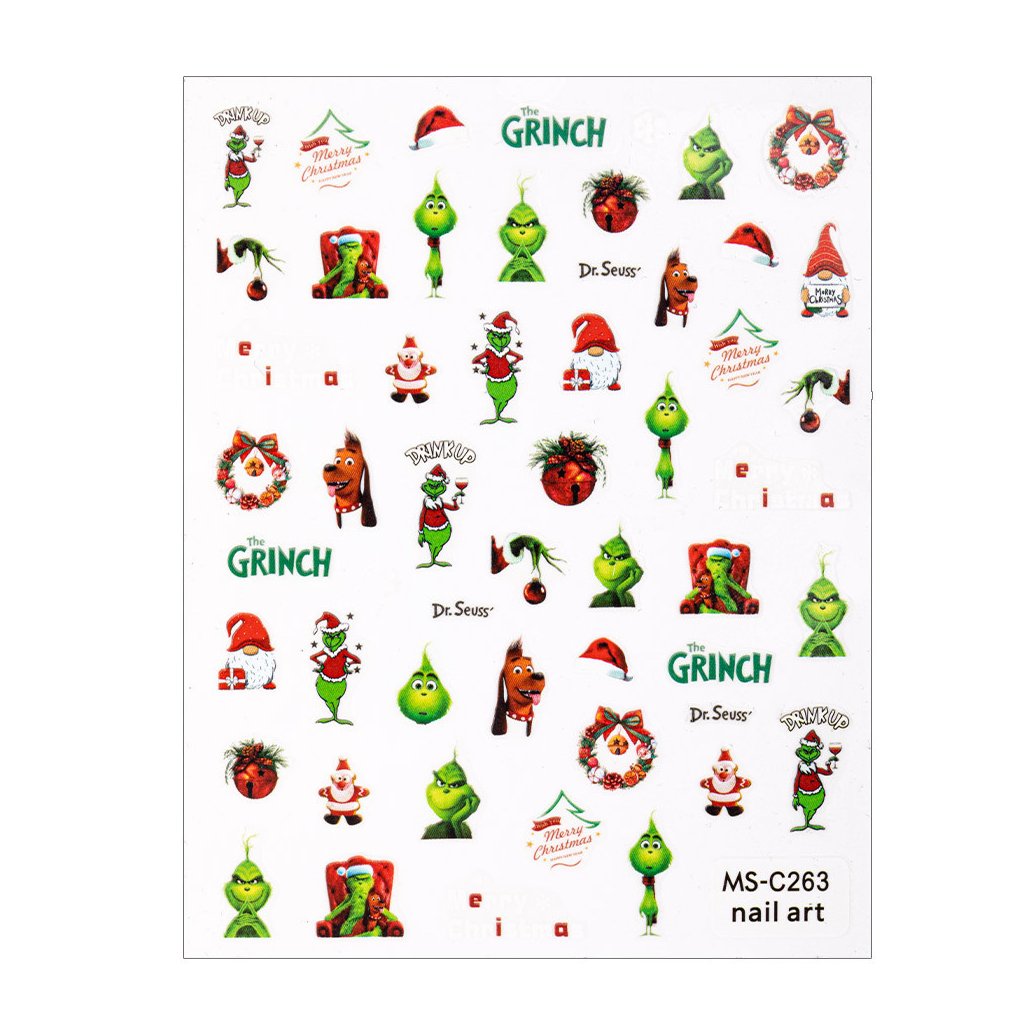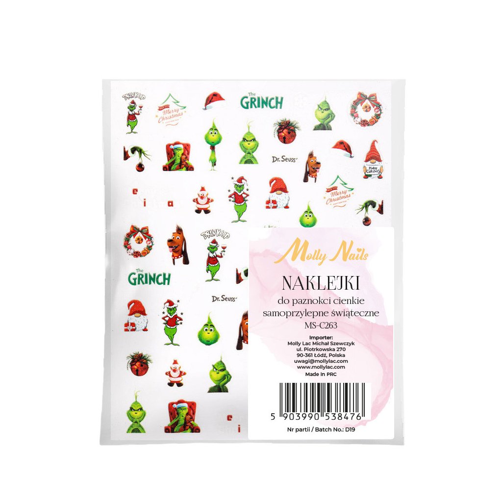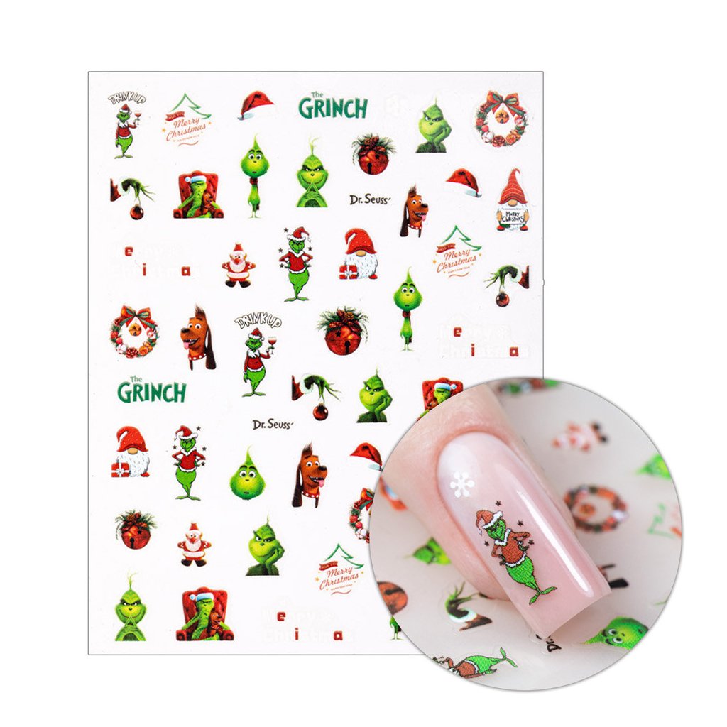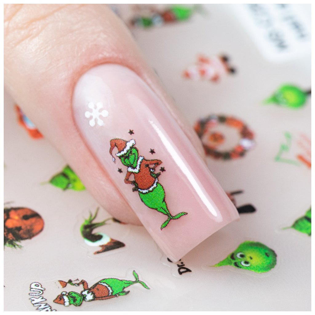 Vánoční samolepky na nehty s motivem Grinche v různých pózách, Santovou čepicí, cukrovými hůlkami, nápisy a ozdobami vytvoří hravý a výrazný vánoční design, který okamžitě přitáhne pozornost. Barevné ilustrace vyniknou na světlém i tmavém podkladu a díky tenké, pružné fólii krásně přilnou bez zvedání nebo mačkání. Po přetření top coatem vypadají jako precizně malované motivy. Skvělá volba, pokud chcete mít vánoční nehty originální, veselé a hotové za pár vteřin.